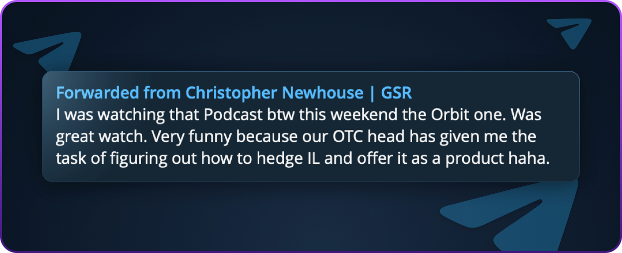 Take a look at one of our more recent TBP podcast episodes with Caroline Mauron, Co-Founder of OrBit Markets. We deep dive into crypto exotics, the emergence of crypto-specific exotics such as impermanent lost swaps, and talk more about OTC counterparty risk.